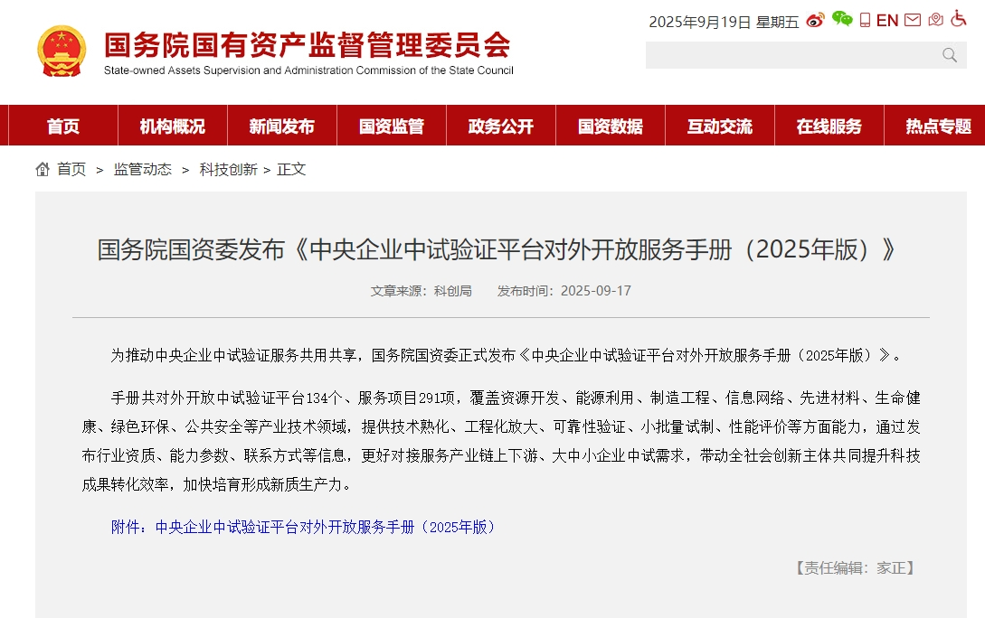 近日,國資委辦公廳發文公布《中央企業中試驗證平臺對外開放服務目錄(2025)》,涵蓋190個平臺的426個對外開放服務項目,旨在推動中...