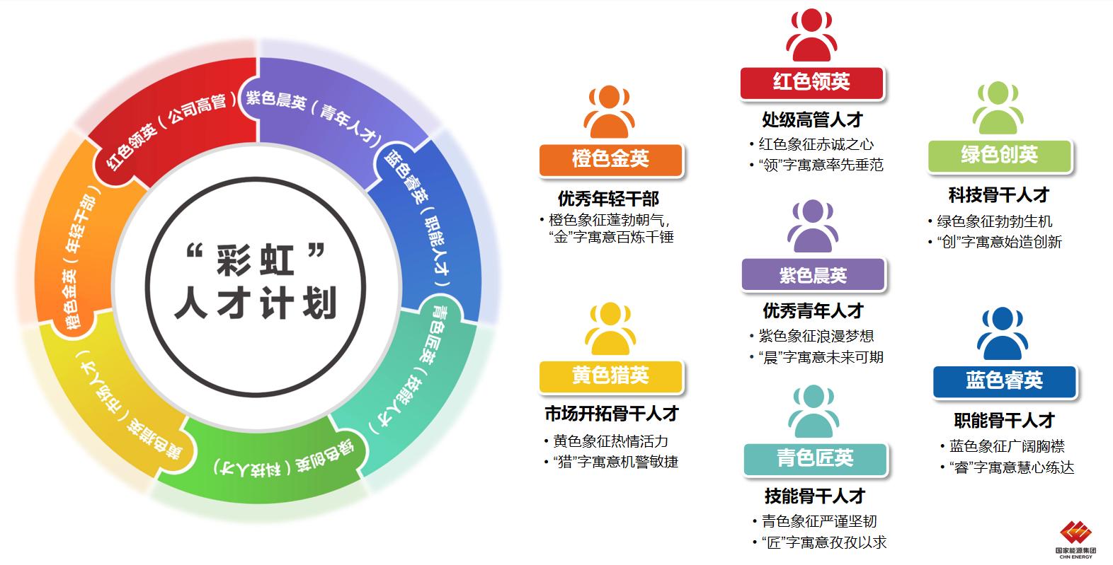 “彩虹人才”計劃以彩虹顏色與崗位特征釋義七類核心骨干:紅色領英、橙色金英、黃色獵英、綠色創英、青色匠英、藍色睿英、紫色晨英。通過制定各顏色人才專項培養計劃、建立“一心五品七力”勝任力模型、設計人才IDP、彩虹人才專項培訓、考核人才培養“四率”,促進員工內在成才需求與企業高質量發展總目標有機融合。